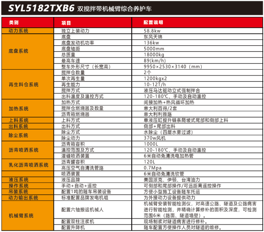 SYL5182TXB6 雙攪拌帶機械臂路面綜合養(yǎng)護車是一款集現(xiàn)場生產(chǎn)新瀝青混合料、瀝青路面冷料、舊料、銑刨料 100%現(xiàn)場加熱再生利用 ,熱瀝青灑布、裂紋跟蹤灌縫、乳化 瀝青噴灑、為其他裝置提供電力和液壓動力等多種功能于一體的瀝青路面熱再生綜合養(yǎng)護車。配置智能隧道檢測設備 ,一車多能 ,完成對公路、隧道病害? (坑槽、裂紋等)? 進行智能檢測和快速修補??蓪崿F(xiàn)多場合、多路面的各種類養(yǎng)護作業(yè)。養(yǎng)護修補費用低 ,作業(yè)快捷 ,高效率、節(jié)能環(huán)保性能突出等特點。適用于多種路況的中大施工量和高速公路中的隧道的檢測和修補施工。