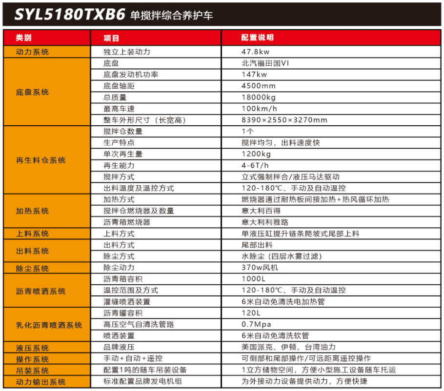 SYL5180TXB6 單攪拌綜合養(yǎng)護(hù)車是一款集現(xiàn)場生產(chǎn)新瀝青混合料、瀝青路面冷料、 舊料、銑刨料 100%現(xiàn)場加熱再生利用 ,熱瀝青灑布、裂紋跟蹤灌縫、乳化瀝青噴灑、為 其他裝置提供電力和液壓動(dòng)力等多種功能于一體的瀝青路面熱再生綜合養(yǎng)護(hù)車。可實(shí)現(xiàn)多 場合、多路面的各種類養(yǎng)護(hù)作業(yè) ,養(yǎng)護(hù)修補(bǔ)費(fèi)用低 ,作業(yè)快捷 ,高效率、節(jié)能環(huán)保性能突 出等特點(diǎn)。適用于遠(yuǎn)郊較寬闊區(qū)域中小施工量和高速公路的修補(bǔ)施工。