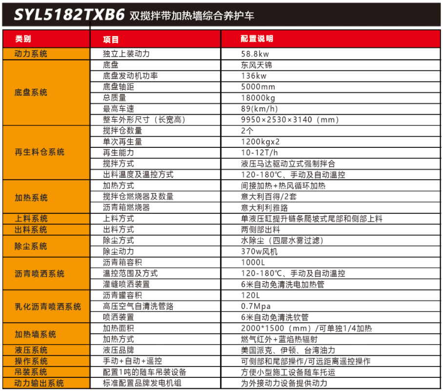 SYL5182TXB6 雙攪拌帶加熱墻路面綜合養(yǎng)護(hù)車(chē)是一款集現(xiàn)場(chǎng)生產(chǎn)新瀝青混合料、瀝 青路面冷料、? 舊料、銑刨料 100%現(xiàn)場(chǎng)加熱再生利用 ,熱瀝青灑布、裂紋跟蹤灌縫、乳化 瀝青噴灑、為其他裝置提供電力和液壓動(dòng)力等多種功能于一體的瀝青路面熱再生綜合養(yǎng)護(hù) 車(chē)。配置智能燃?xì)饧t外線加熱墻 ,可輕松對(duì)路面進(jìn)行全方位加熱 ,可實(shí)現(xiàn)多場(chǎng)合、多路面 的各種類(lèi)養(yǎng)護(hù)作業(yè)。養(yǎng)護(hù)修補(bǔ)費(fèi)用低 ,作業(yè)快捷 ,高效率、節(jié)能環(huán)保性能突出等特點(diǎn)。主要適用于多種路況的中大施工量和高速公路的修補(bǔ)施工。