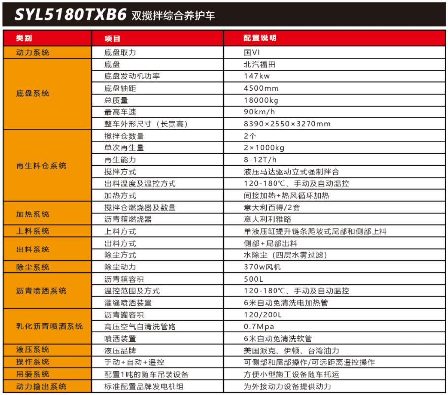 SYL5180TXB6 雙攪拌路面綜合養(yǎng)護(hù)車是一款集現(xiàn)場生產(chǎn)新瀝青混合料、瀝青路面冷 料、舊料、銑刨料 100%現(xiàn)場加熱再生利用,熱瀝青灑布、裂紋跟蹤灌縫、乳化瀝青噴灑、 為其他裝置提供電力和液壓動(dòng)力等多種功能于一體的瀝青路面熱再生綜合養(yǎng)護(hù)車??蓪?shí)現(xiàn) 多場合、多路面的各種類養(yǎng)護(hù)作業(yè) ,養(yǎng)護(hù)修補(bǔ)費(fèi)用低 ,作業(yè)快捷 ,高效率、節(jié)能環(huán)保性能突出等特點(diǎn)。適用于多種路況的中大施工量和高速公路的修補(bǔ)施工。